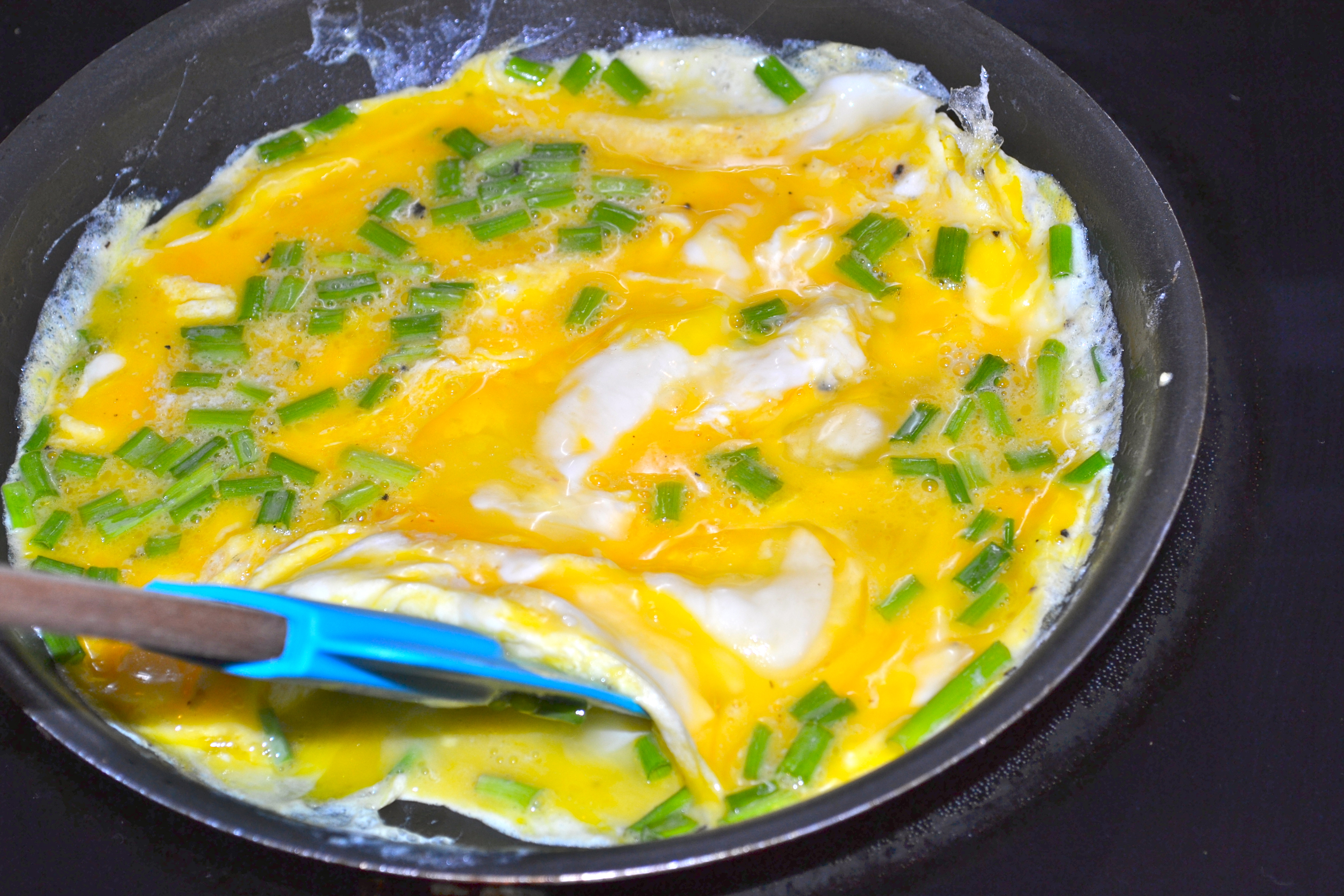 Just in case there’s someone out there who’s never made an omelette (is there?), the practice is simple: lift up the edges of the omelette and swirl the egg around to make the omelette fluffy and cook as much of it as you can. What you are aiming for is a cooked golden crust and a soft eggy center.