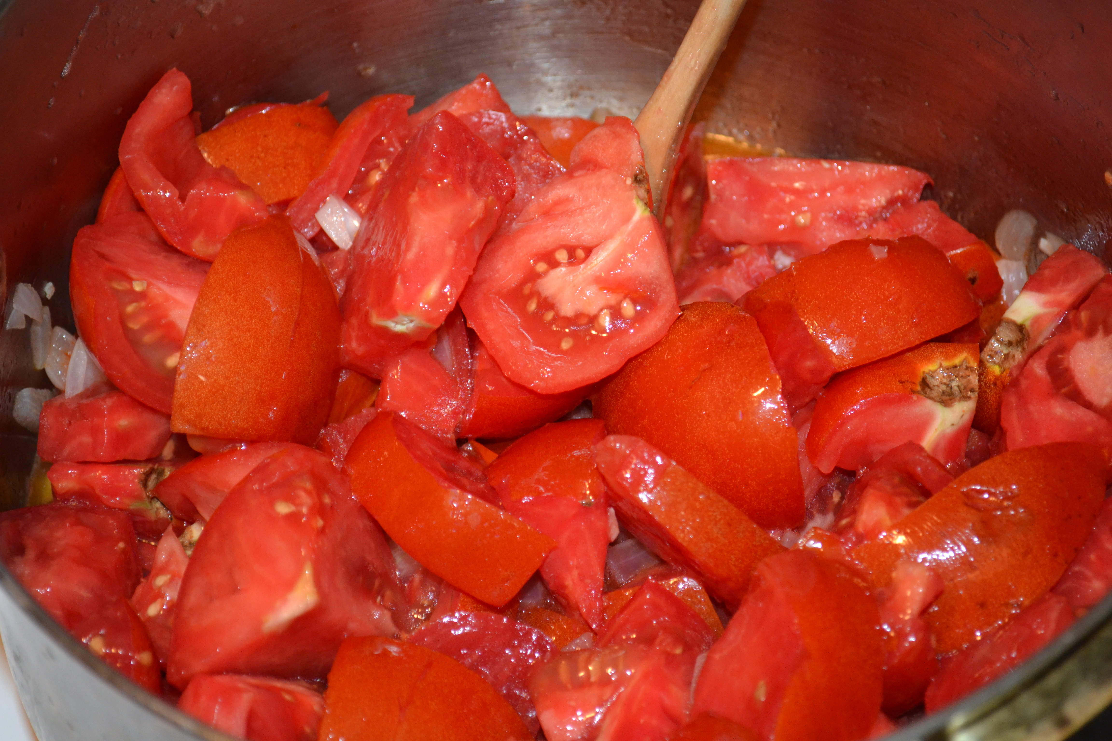 3. Heat up a good glug of olive oil and gently fry the onion and garlic ‘for a spell’. When soft and translucent add in the mountain of tomatoes. Bring to a boil and then turn down to simmer.