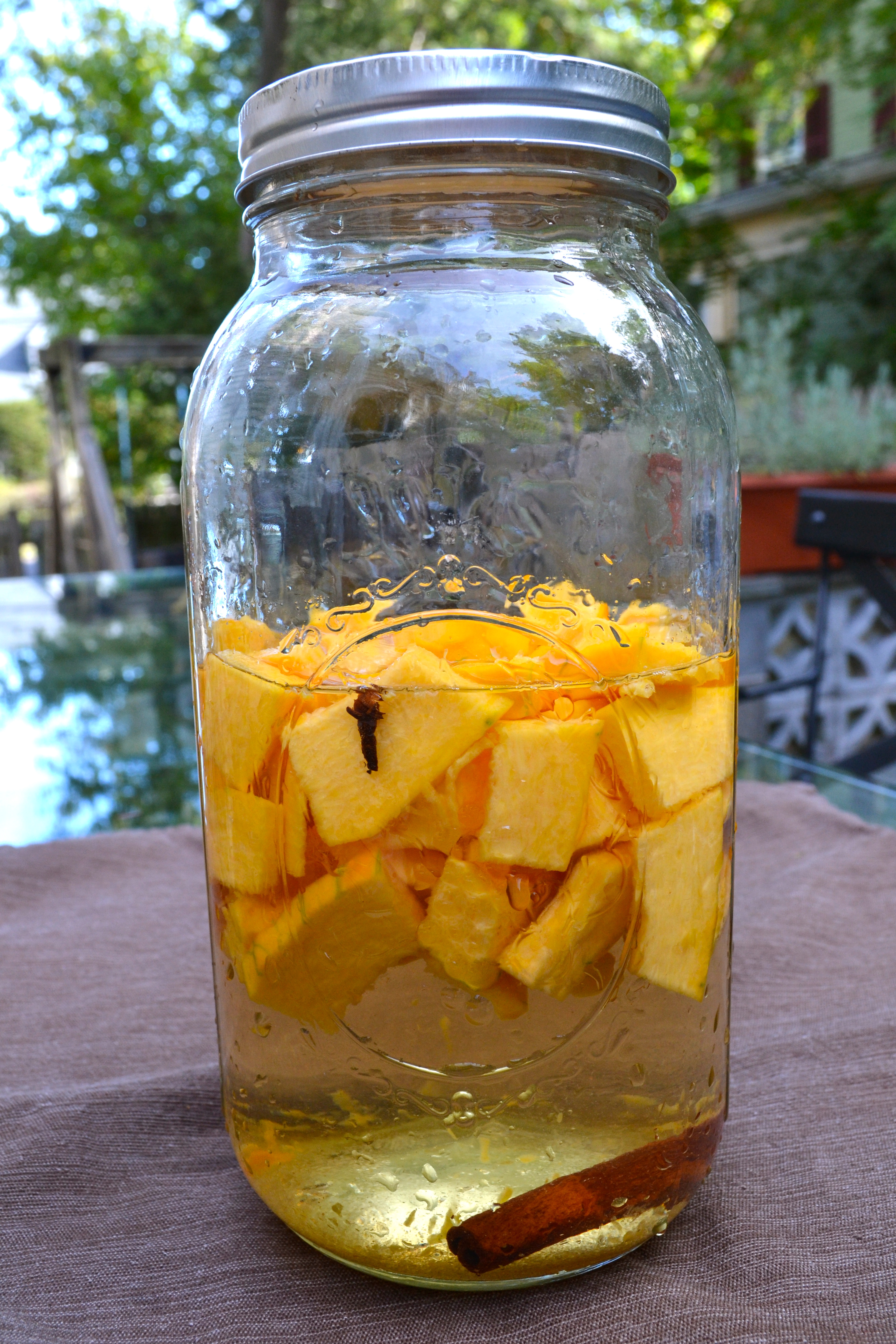 Oh how I love summer and dread for it to end. Then a switch goes off and I’m getting out my favorite jeans and it’s jazz hands for Autumn. The…weather…has…been…perfect. How many crisp mornings followed by warm afternoons blanketed in blue skies as the trees are just hinting that they are changing color can a girl have? I bought my first sugar pumpkin. I dreamt of chewy ginger cookies. And now I shall make my first ever batch of spiced pumpkin vodka. Per che? Por quoi? Well, for a pumpkin martini of course. Or maybe just to sip on if it turns out well.