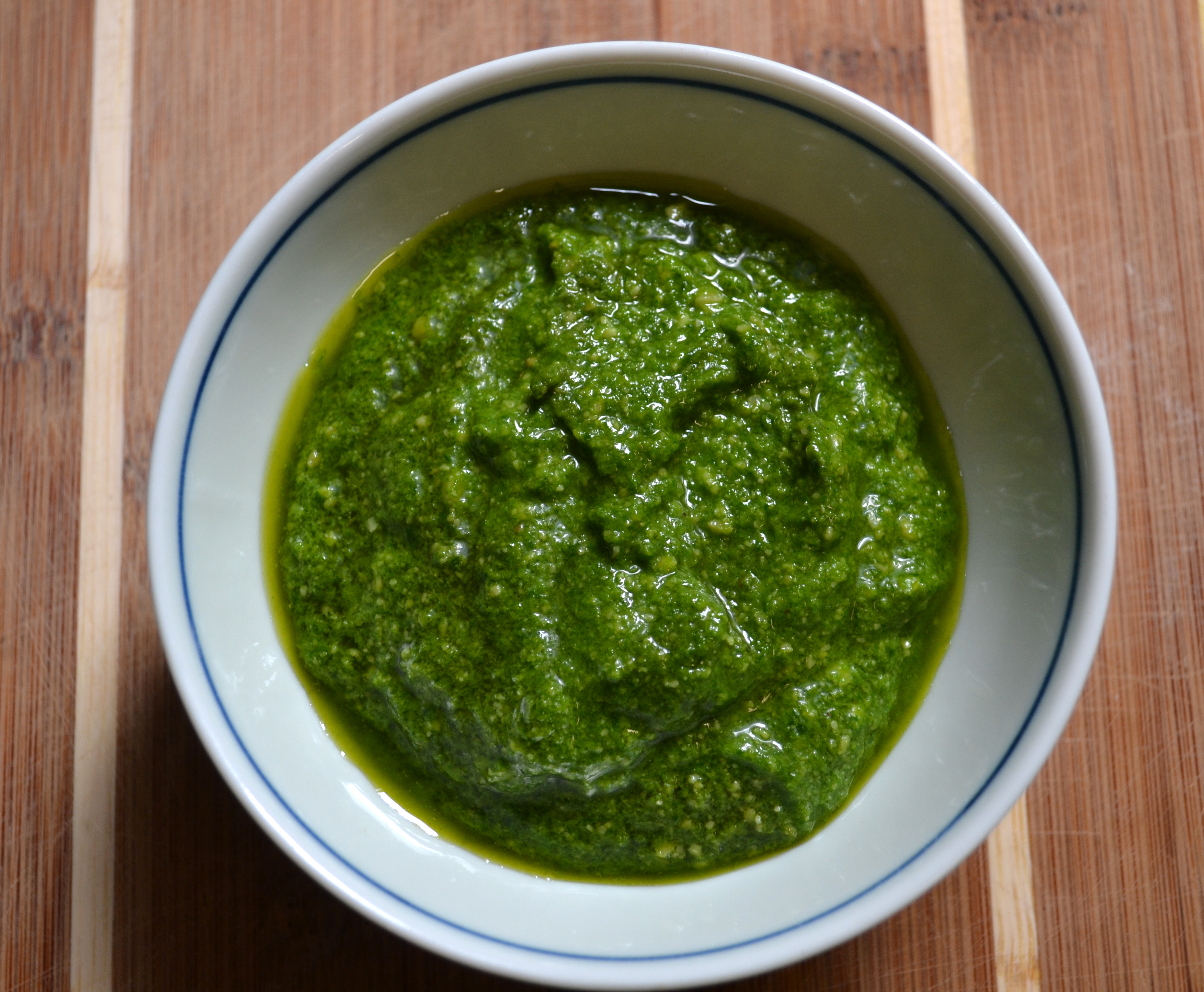 My favorite is plain old basil and pine nut pesto. NOTHING tops it. But use what you have, and this is pretty good too.