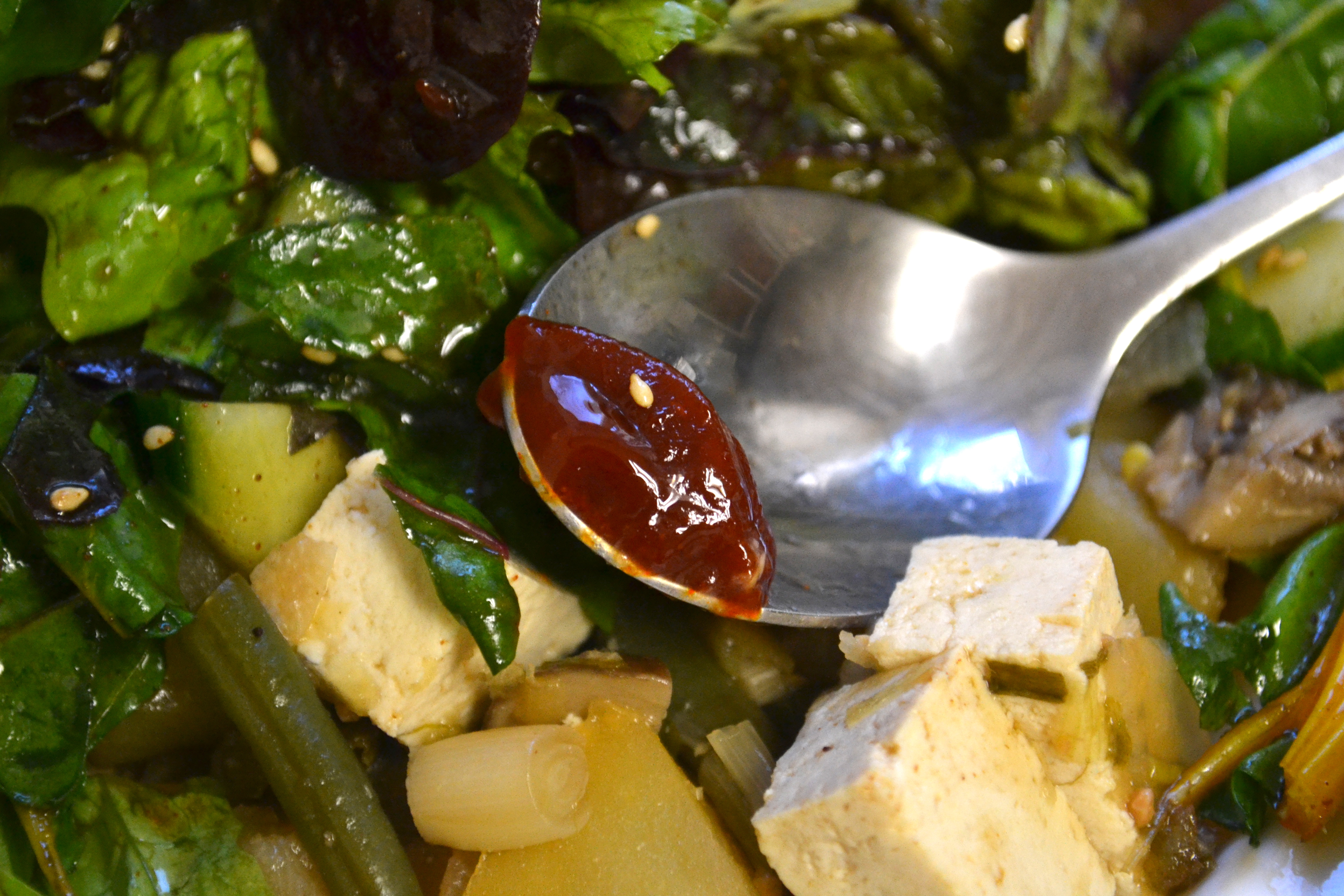 The soup, barley rice and salad can be eaten as three separate dishes, or all mixed together as the Maangchi blog suggests. Don’t forget to add the gochujang to your bowl–as much as you like!
