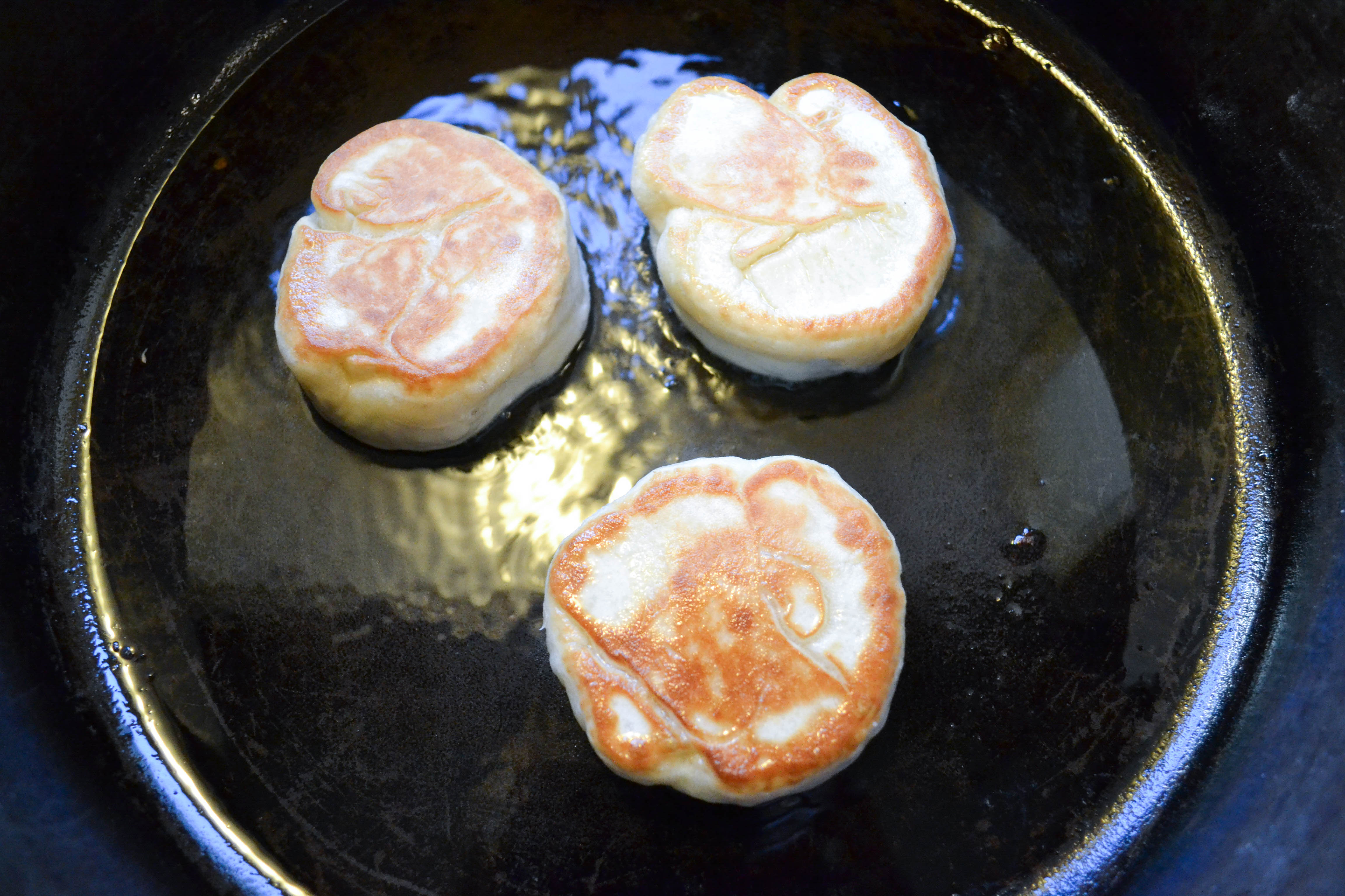8) With a spatula or hotteok press, press the dough balls down until they are flattened discs. Fry till that side is golden brown and then flip again. When both sides are browned, lower the heat, cover and cook for another minute.