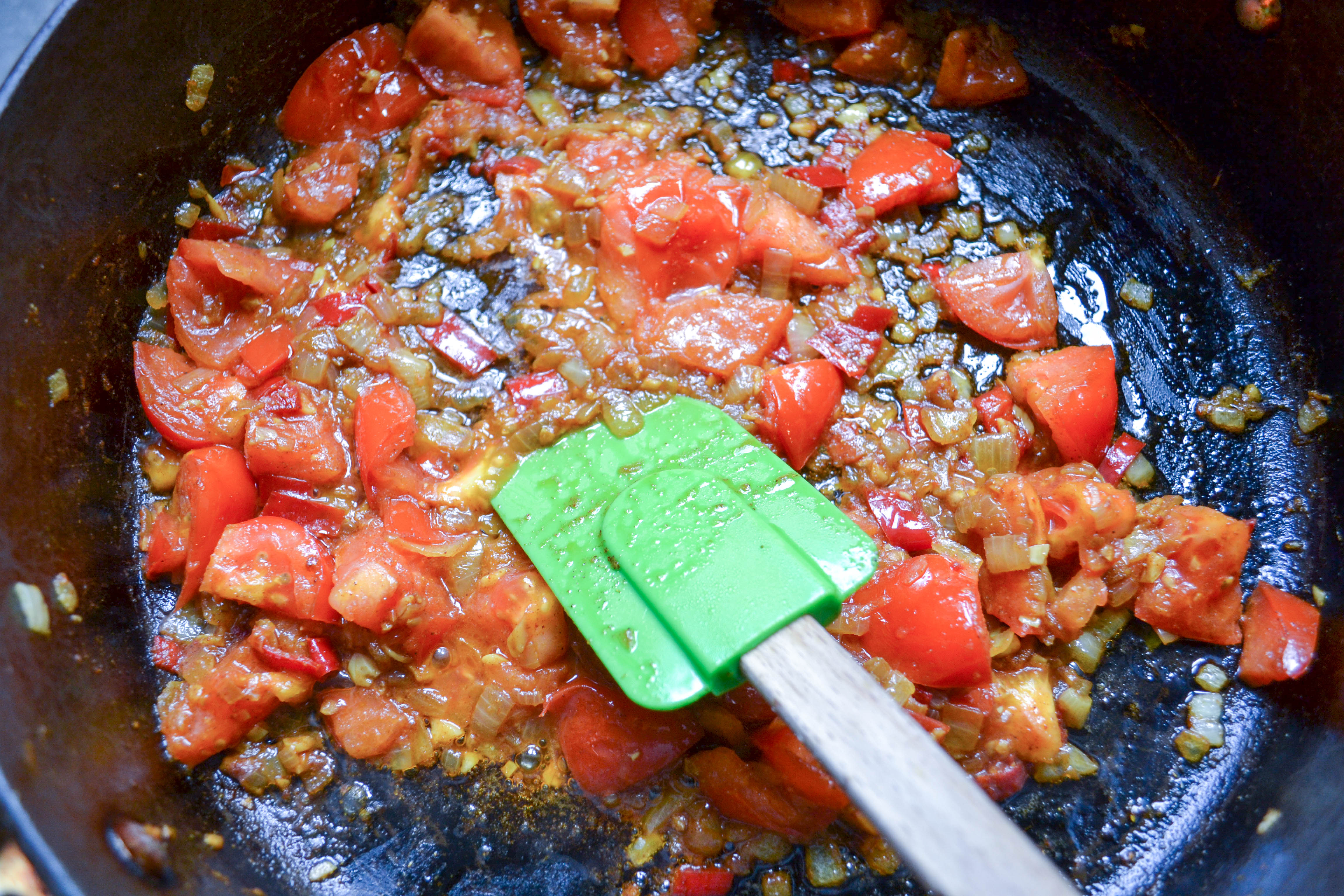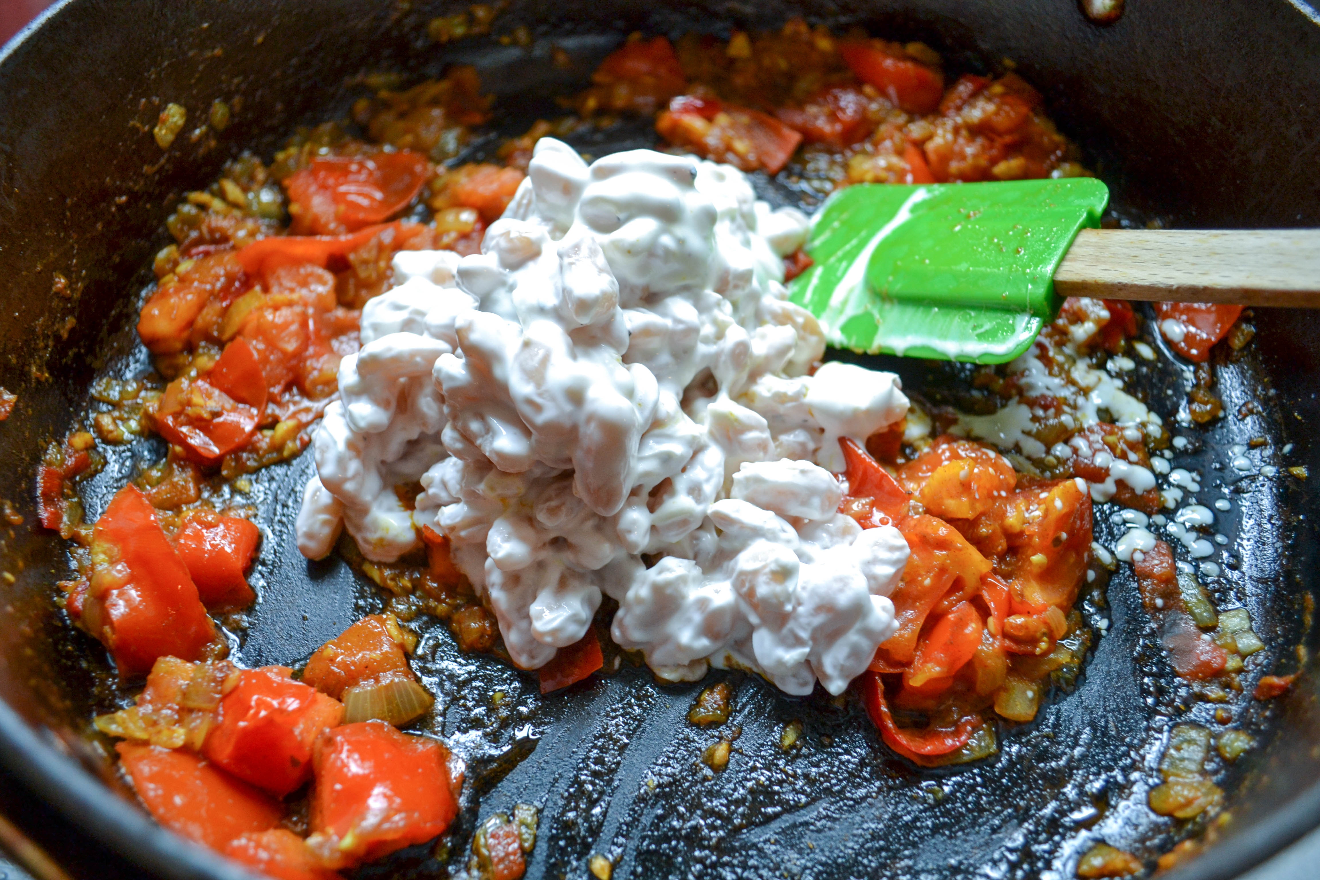 5) Add the tomato and when it has broken up and cooked down, add the yogurt bean mixture. Mix together and then add the fresh greens and about a cup of water.