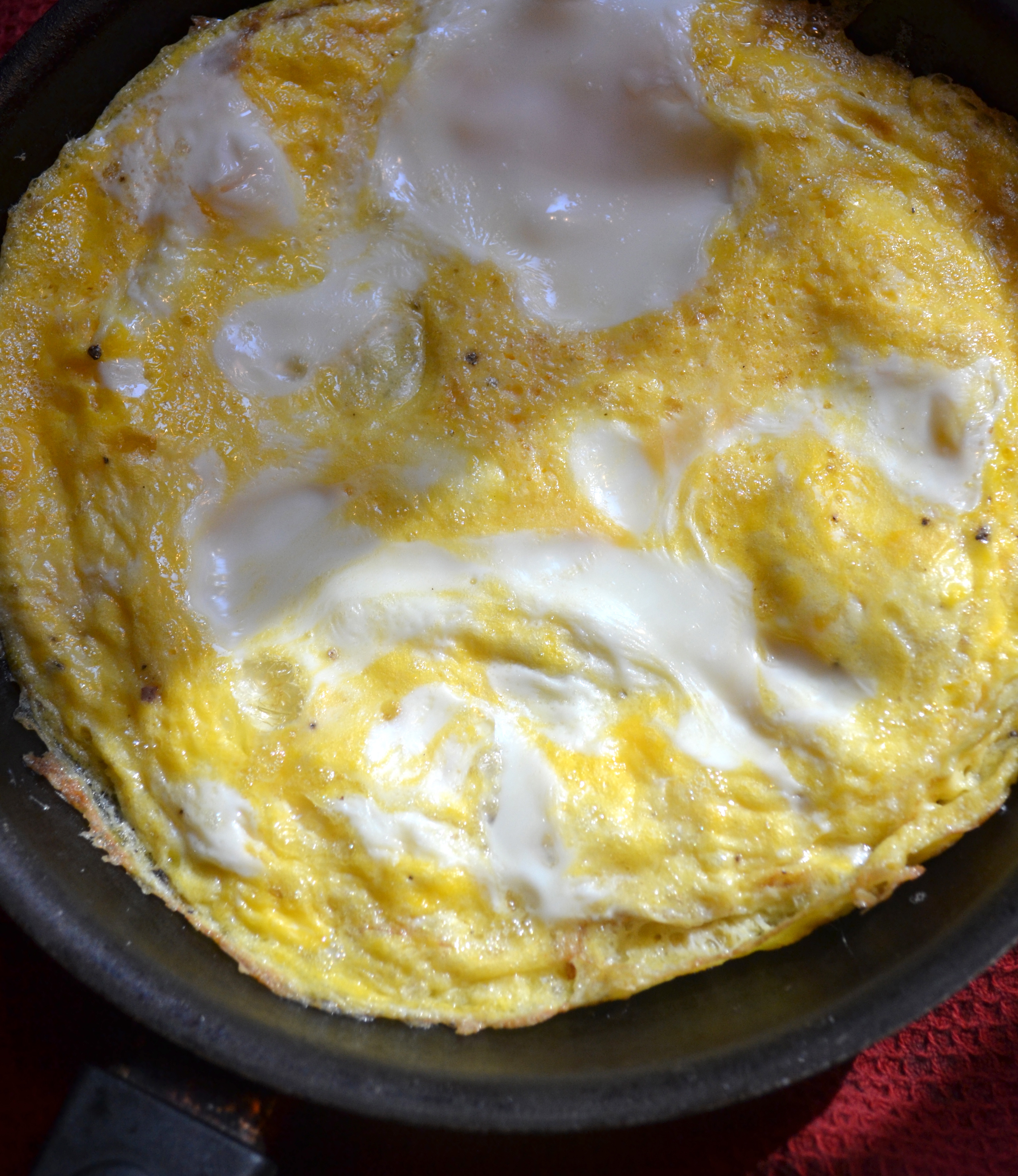 – do this a couple of times until the omelette is mostly cooked. It should be golden on the bottom and just a little runny up top. Don’t over cook it. Omelettes should be soft in the middle.