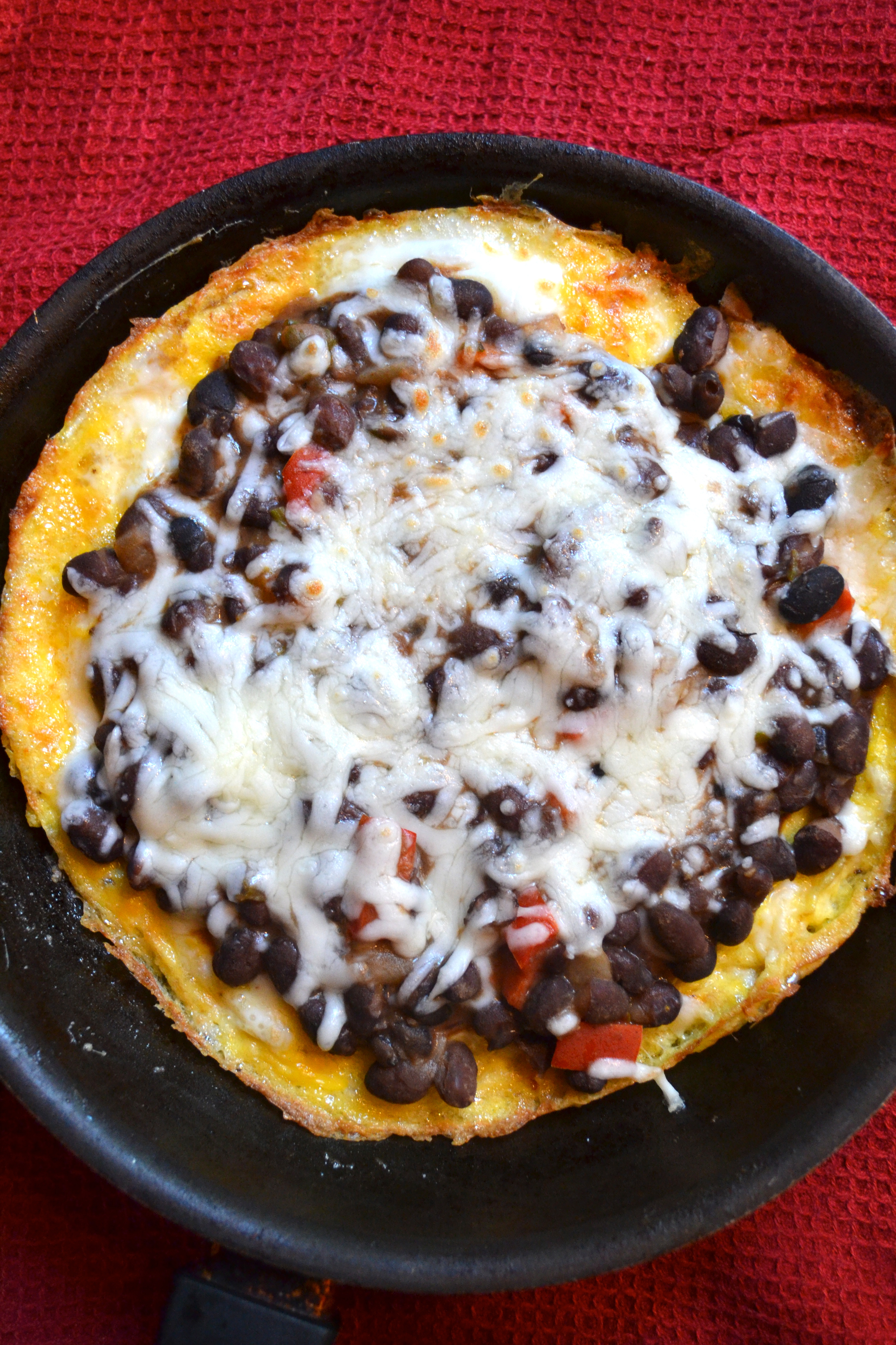 2. Add the veggie chili (in my case, black bean chili) and the shredded cheese on top of the cooked omelette.