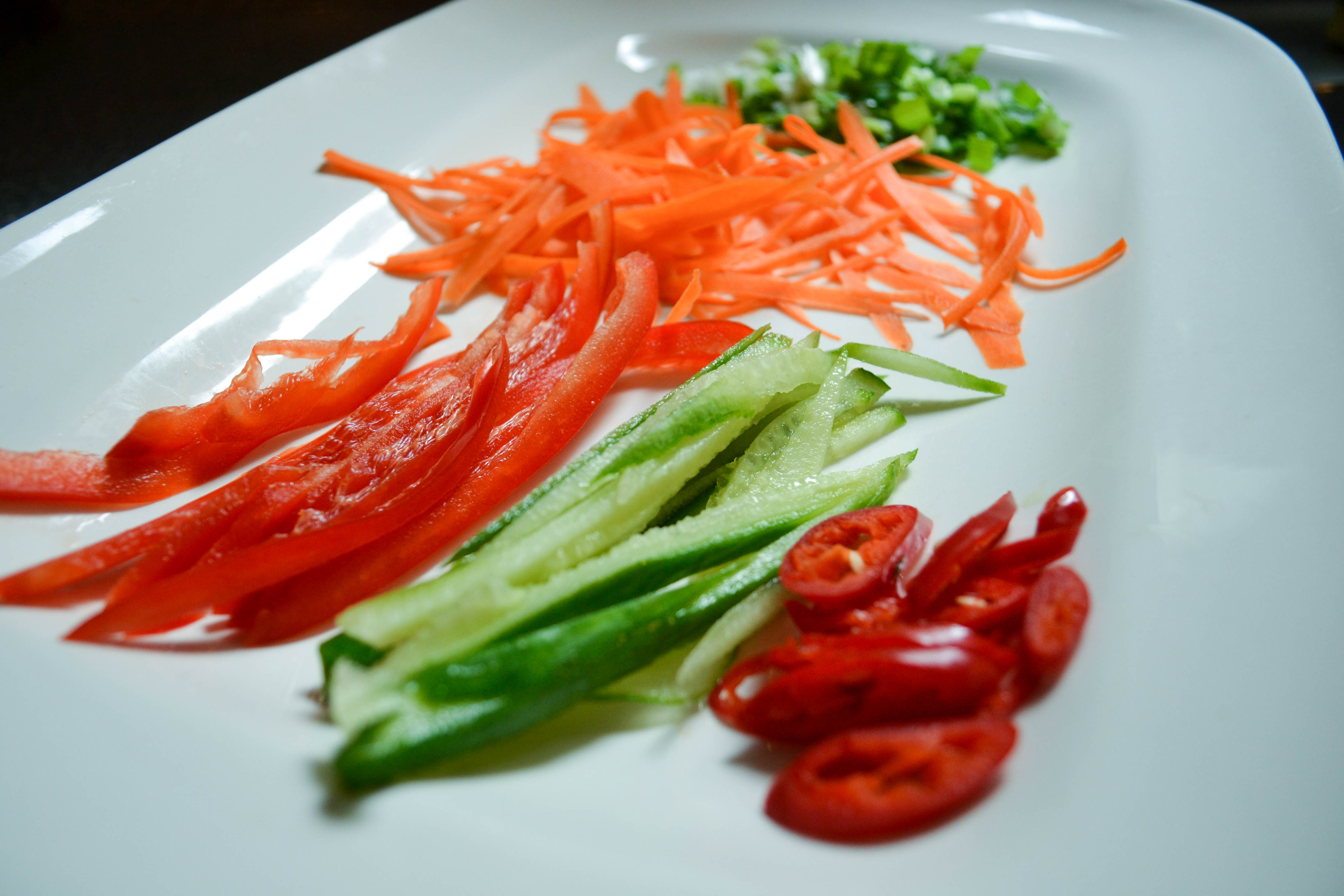 2) Prep the veggies by grating the carrot or using a carrot peeler to slice finely. Slice and julienne the red pepper and cucumber the same way.