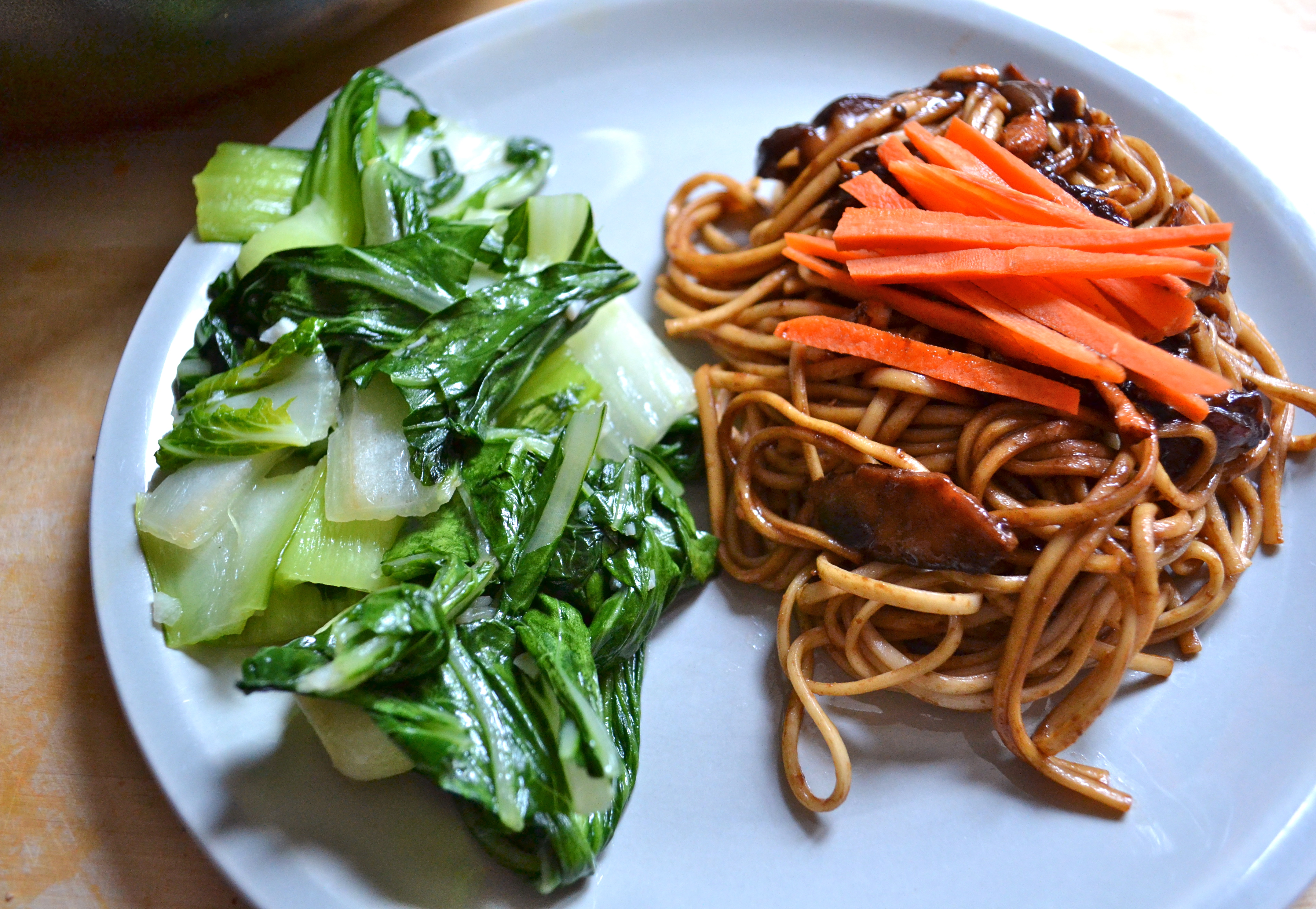 Combination of sliced/chopped vegetables, such as 1 cup mushrooms, 2 cups dark leafy greens of choice (kale, spinach, dandelion, chard, etc) 1 cup bell peppers, 1/2 cup baby corn