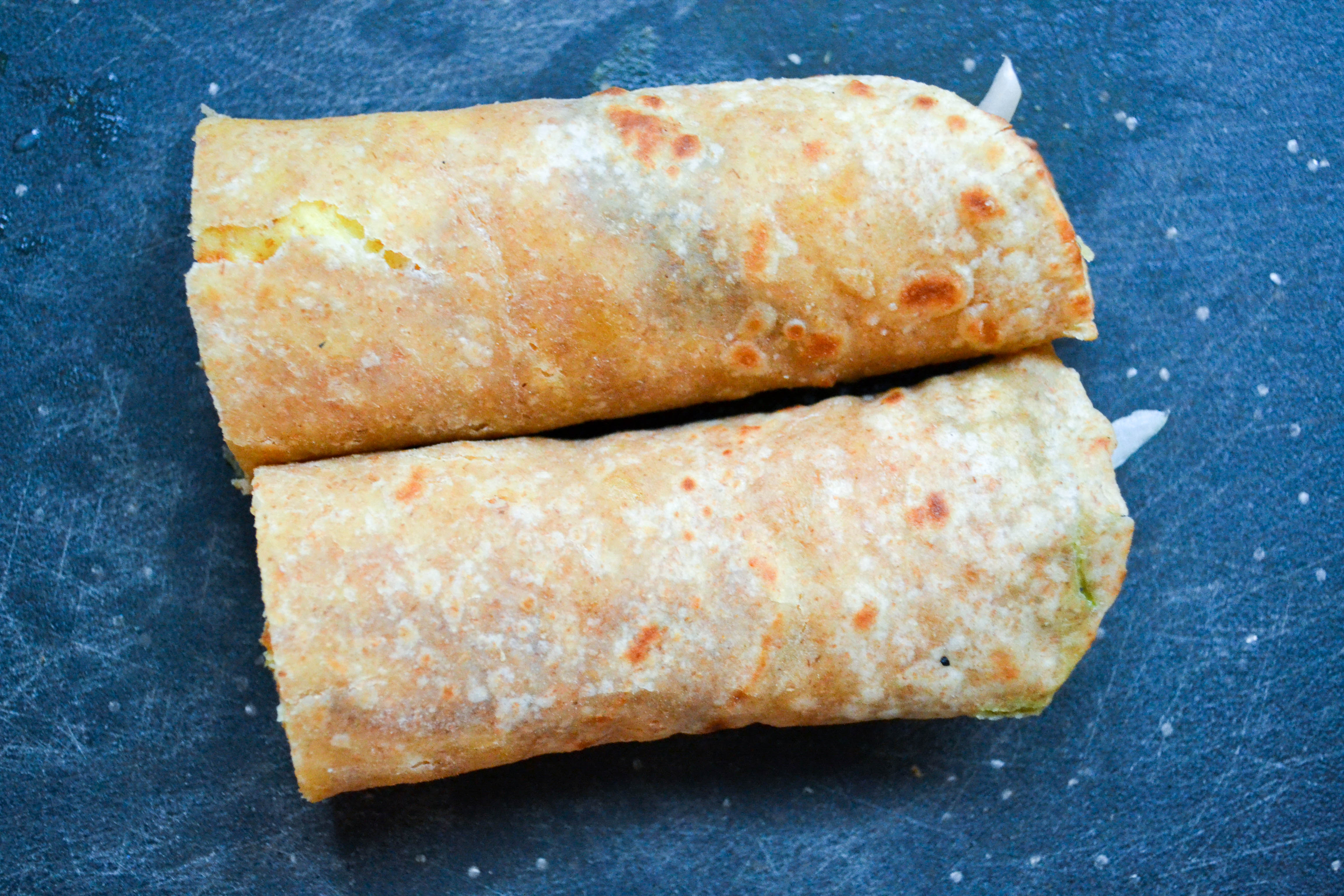 4) Cut in half and roll in paper towel or tin foil to eat as a sandwich. Repeat for the second egg roll.
