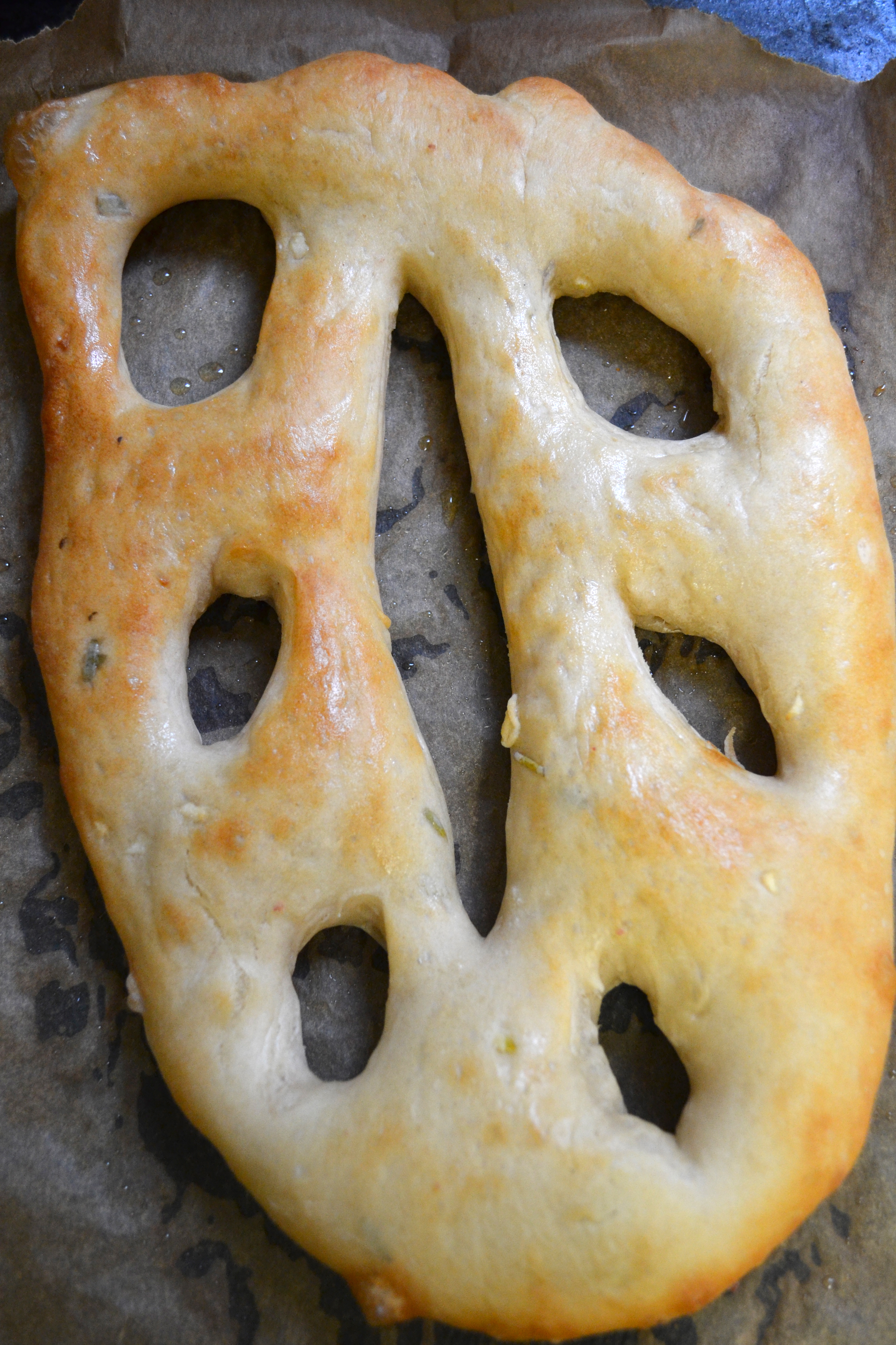 *I used my Kitchen Aid to mimic something I saw the French Pastry School do. Many recipes for fougasse involve it rising in the fridge overnight, but the French Pastry School has a recipe for kneading the dough on a fast speed of the Kitchen Aid and they only have it rising for a few hours. If you don’t have one, hand-knead and put in a covered and oiled bowl in the fridge overnight before starting step 4.