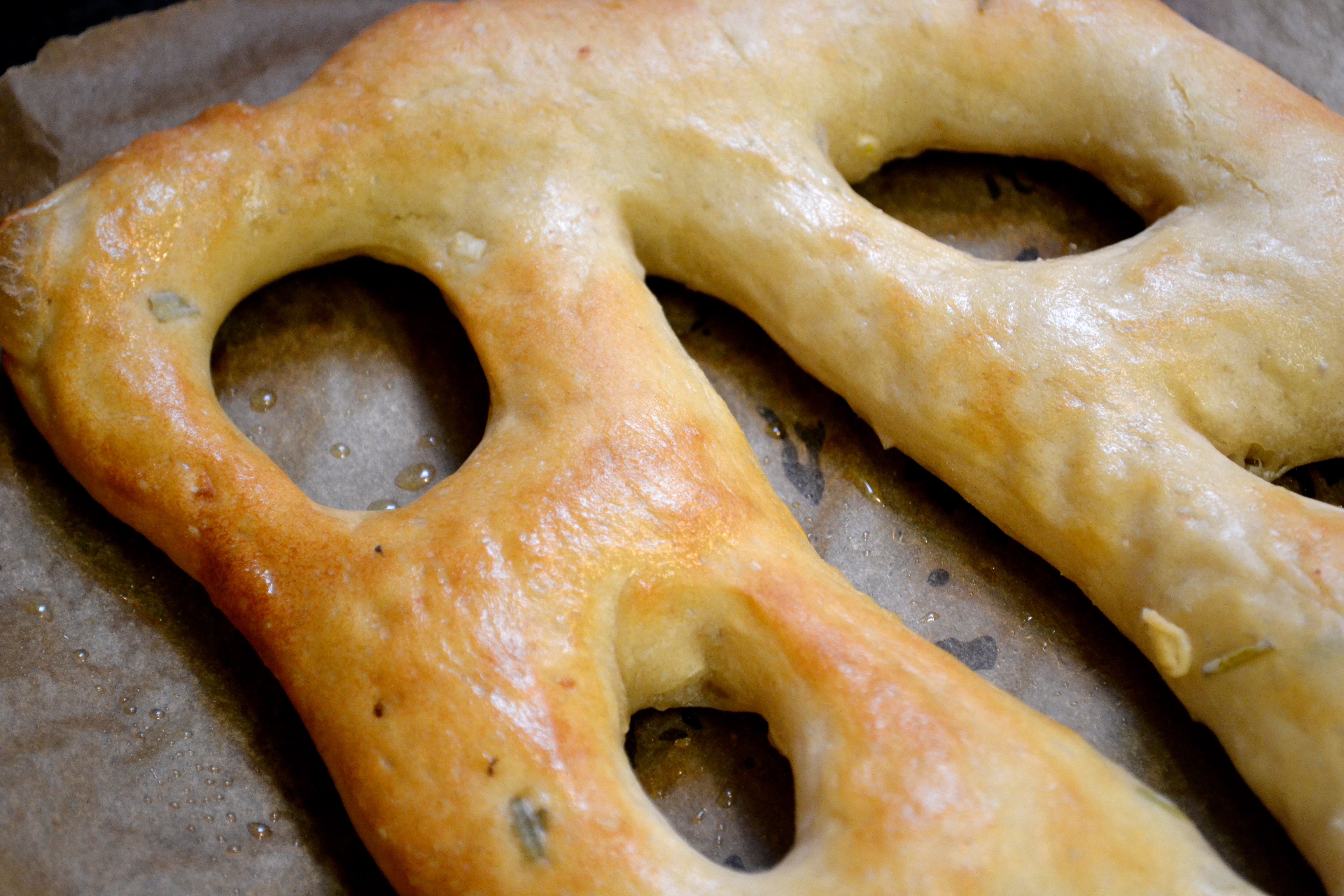6) Cut the risen dough (still sticky) in half with a hand scraper or a thin wooden utensil. Set one half of it aside for now. Starting with the first half, gently fold it over itself to form a nice round shape. With a rolling pin, roll it out on a floured surface gently to form a rectangle shape. Take a pizza cutter or sharp edged scraper and slice down the middle of the bread. Gently pull it apart. Then make three diagonal slits on each side of that cut and gently pull apart. The dough will rise again so the holes need to be fairly big. Place on a tray covered with baking parchment. Repeat with the other half of the dough.