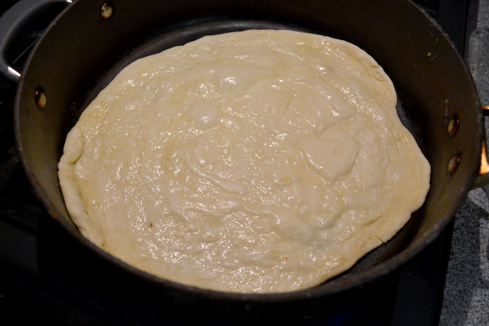 9) Roll this dough out carefully so that the center stays the center and the oil layers spread out evenly in the dough. Roll it out as thin as you can (or as big as your frying pan can accommodate).
