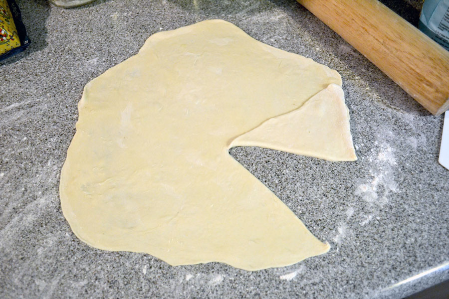 7) Starting from the center of the dough, cut a straight line out to the edge and fold a little bit of the dough over onto itself to make a small triangle. Keep rolling it around until you have completely rolled the dough into a fat cone shape.