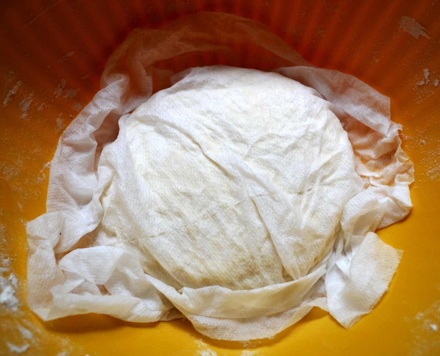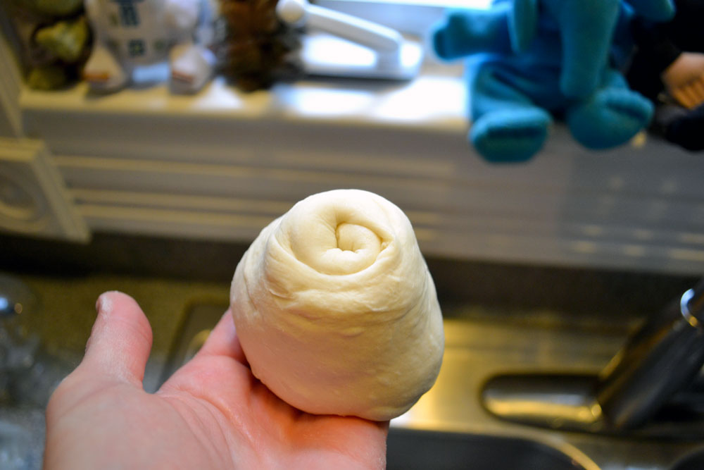 4) The dough should now be wonderfully soft and smooth. Sprinkle flour on a work surface, divide the dough into three pieces (or four if you do not have a large frying pan).