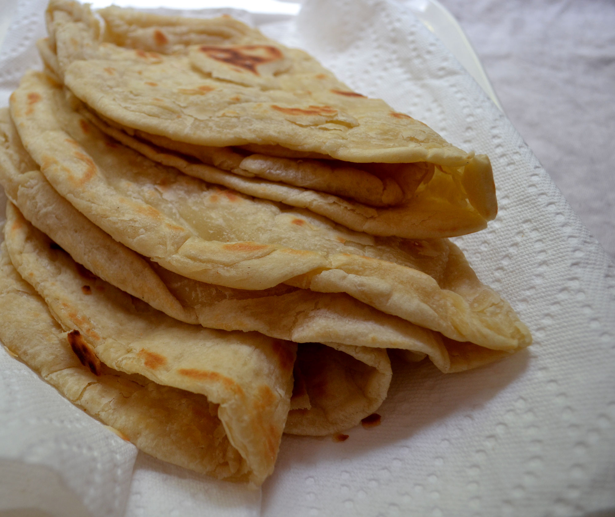 My neighbor and friend brought over some roti and vegetable curry she’d made to one of our parties and I’ve been thinking about it ever since. Not just because it was getting a bit late and all the hot food had been gobbled up by hungry guests when suddenly this aromatic chickpea and potato curry appeared along with soft, flaky, delicious roti to save the night, but also because it was new to me. I’d never had this style of roti before—large, thin, supple flatbread that looks as fragile as a pastry crust but actually needs a bit of effort to tear off a piece and then is delightfully buttery and chewy to eat.