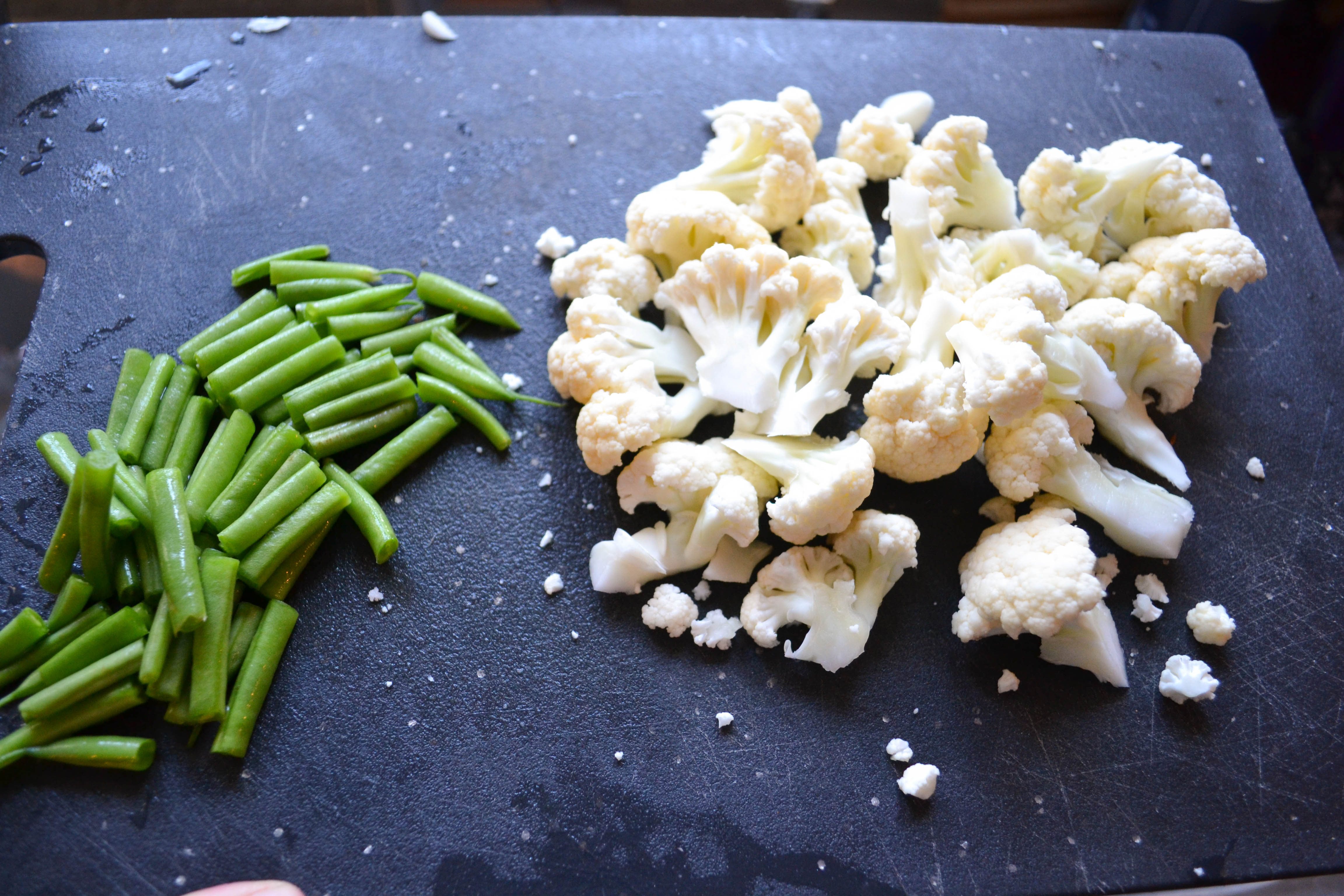 4) Add in the vegetables according to cooking time, so carrots, celery and turnip first. Stir and cook for about five minutes, then add in the cauliflower and green beans. Add a little water if needed.