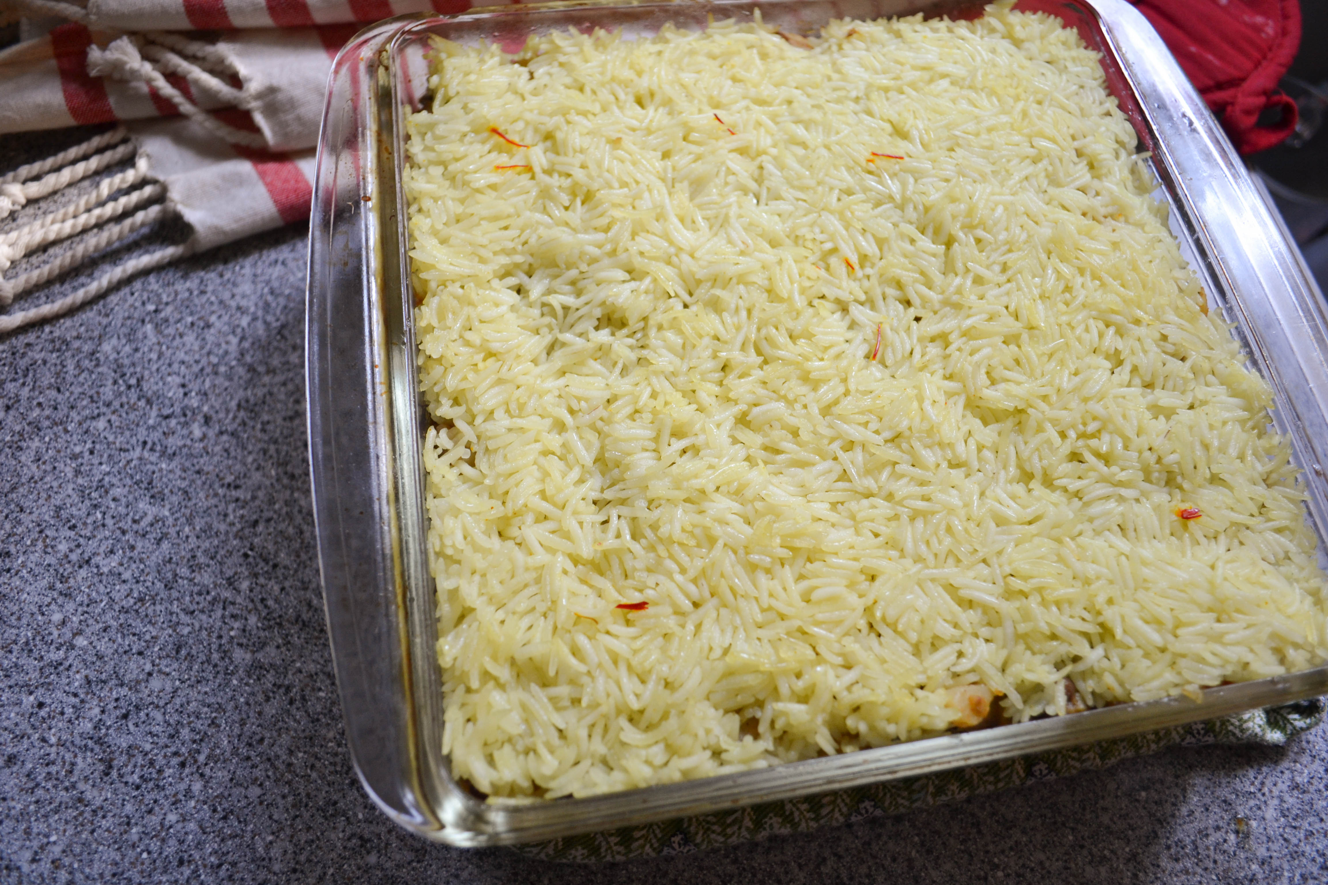 10) Cover with a lid or tightly packed tin foil and cook in the oven on 325-350F for about 20 minutes. While the biriyani is cooking, soak the saffron in a little water.