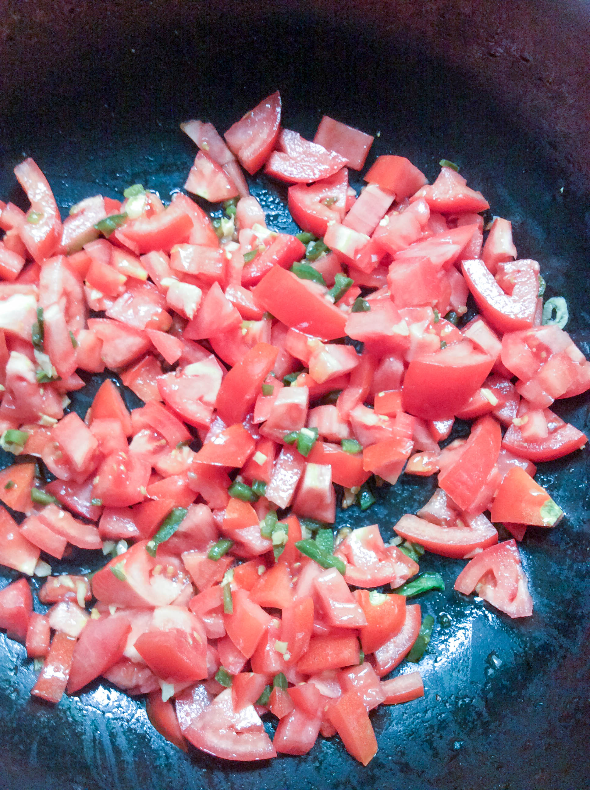 3) Once the garlic/shallot/chili mixture is softening, add in the fresh chopped tomatoes, the sea salt, black pepper, sugar, soy sauce and splash vinegar. Cook on med low for about ten minutes until the tomatoes have completely cooked down.