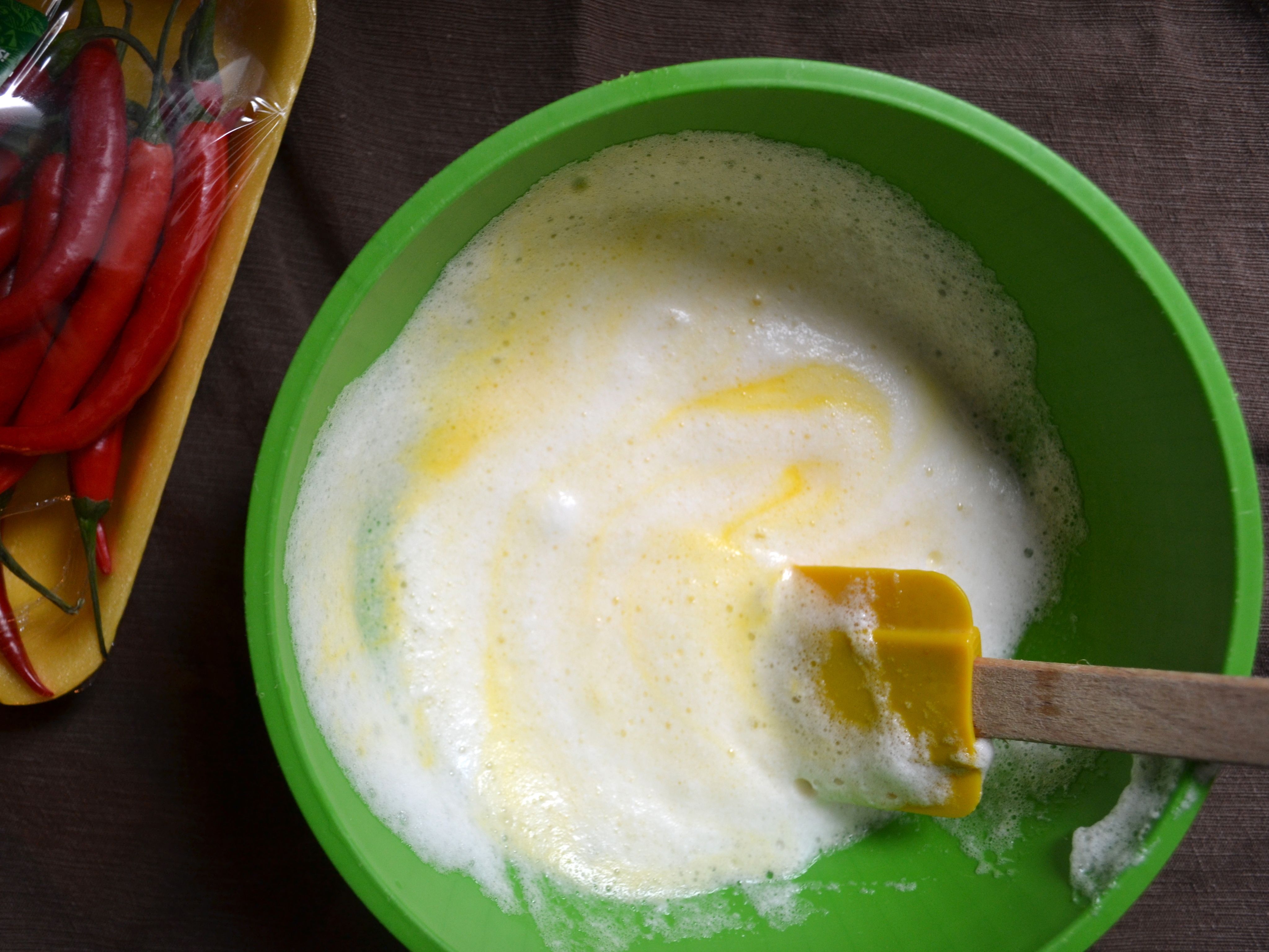 4) Add the cilantro, spring onion and remaining chilies to the egg mixture. Gently fold together.