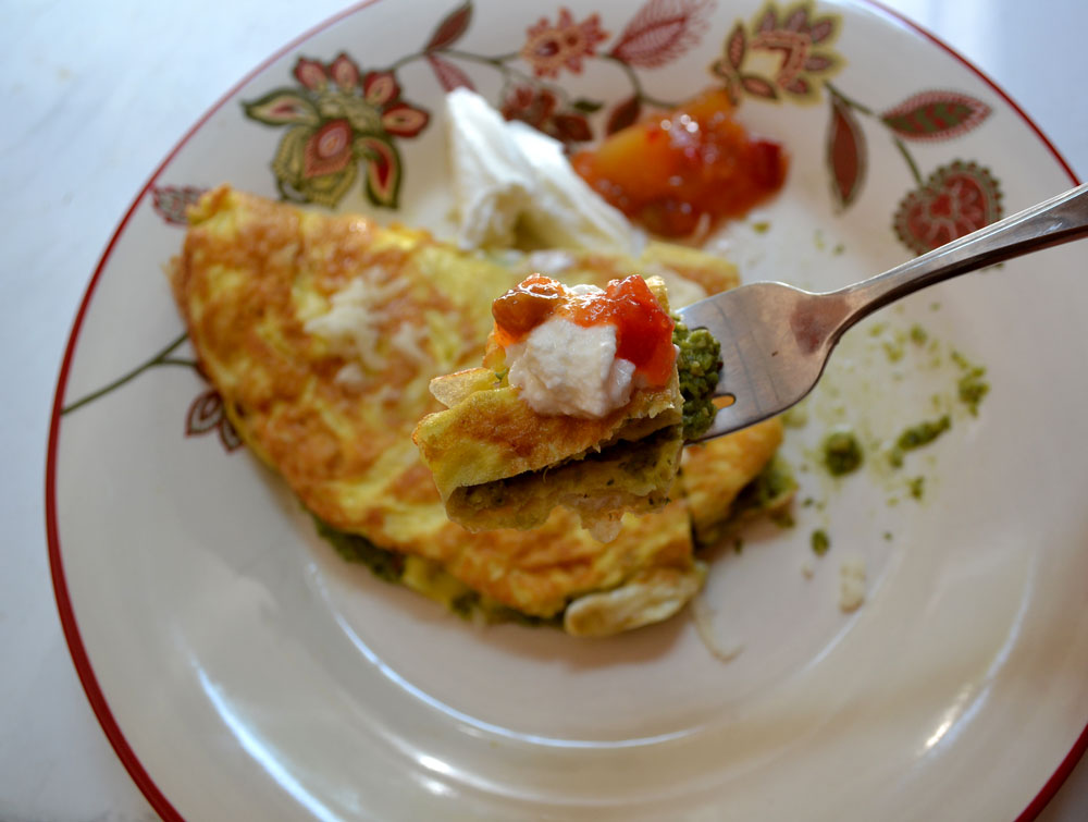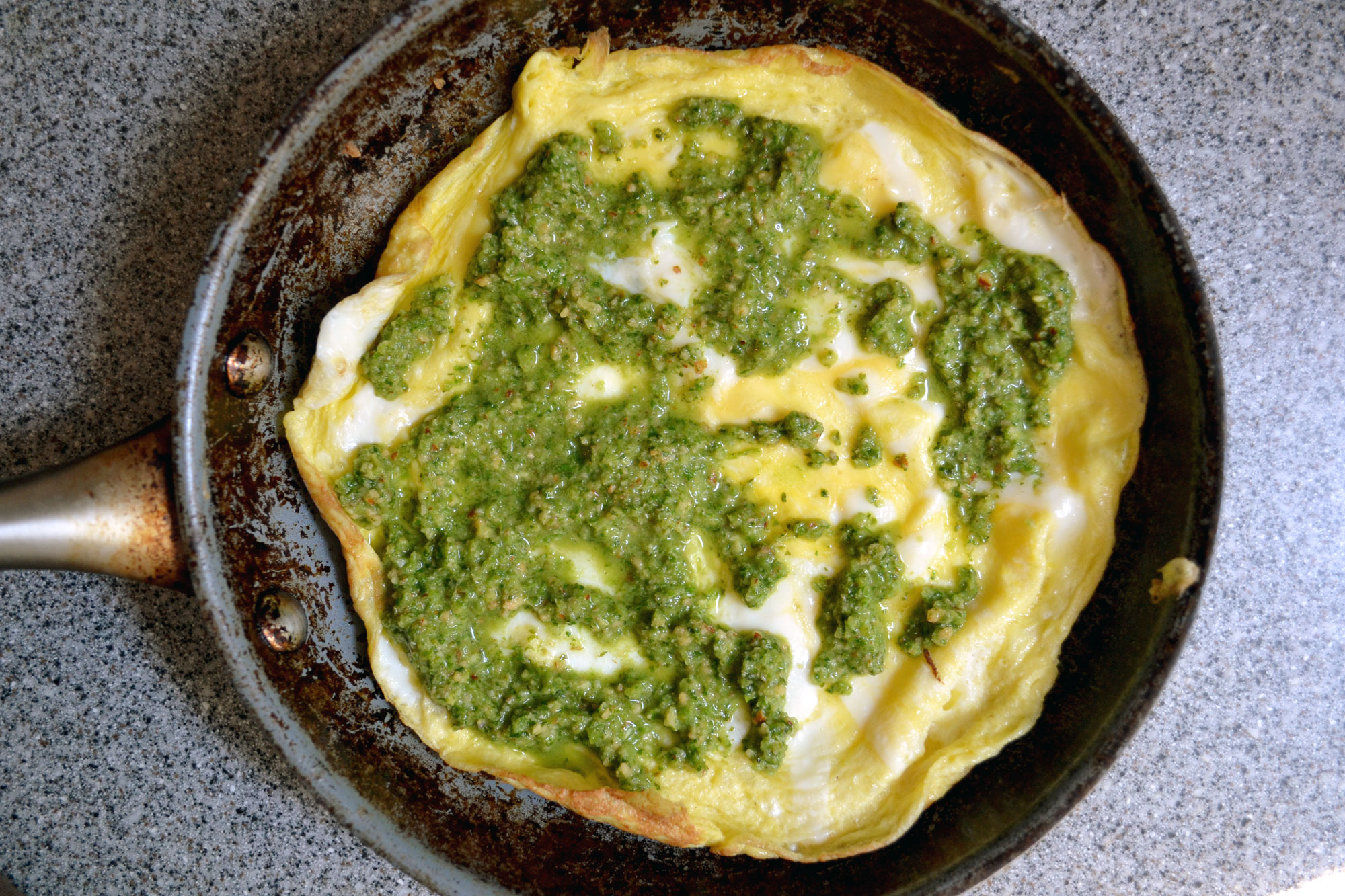 A nice change for an omelette. Include cheese or not. Zingy, a little spicy and quite healthy (especially with no added cheese or yogurt) for a mid-week breakfast. Homemade green chutney is also great in a grilled cheese, a bombay sandwich (one of my favorite sandwiches), on potatoes, scrambled eggs, hashbrowns, etc.