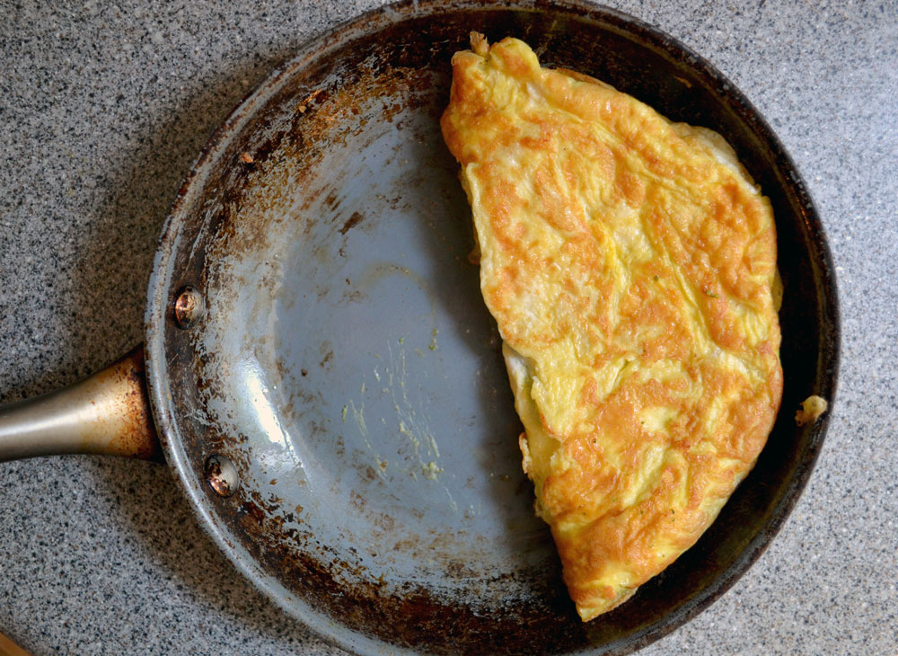 The first time I went to Spain, I noticed these potato omelettes everywhere–on every menu, in every cafe and bar, stuffed inside of bread flutes and sold as sandwiches and sometimes cut into wedges and served to us free with a drink. I was pleasantly surprised to discover that what I thought would be a cold, dry, brick of potato and egg turned out to be soft, moist and delicious. The humble tortilla is not your run-of-the-mill omelette. For one thing it is delicious cold. For another it is delicious warm, hot, on its own, stuffed in bread, or served with homemade romesco and a green salad. It doesn’t feel like a heavy meal either–unless you eat the whole thing yourself.