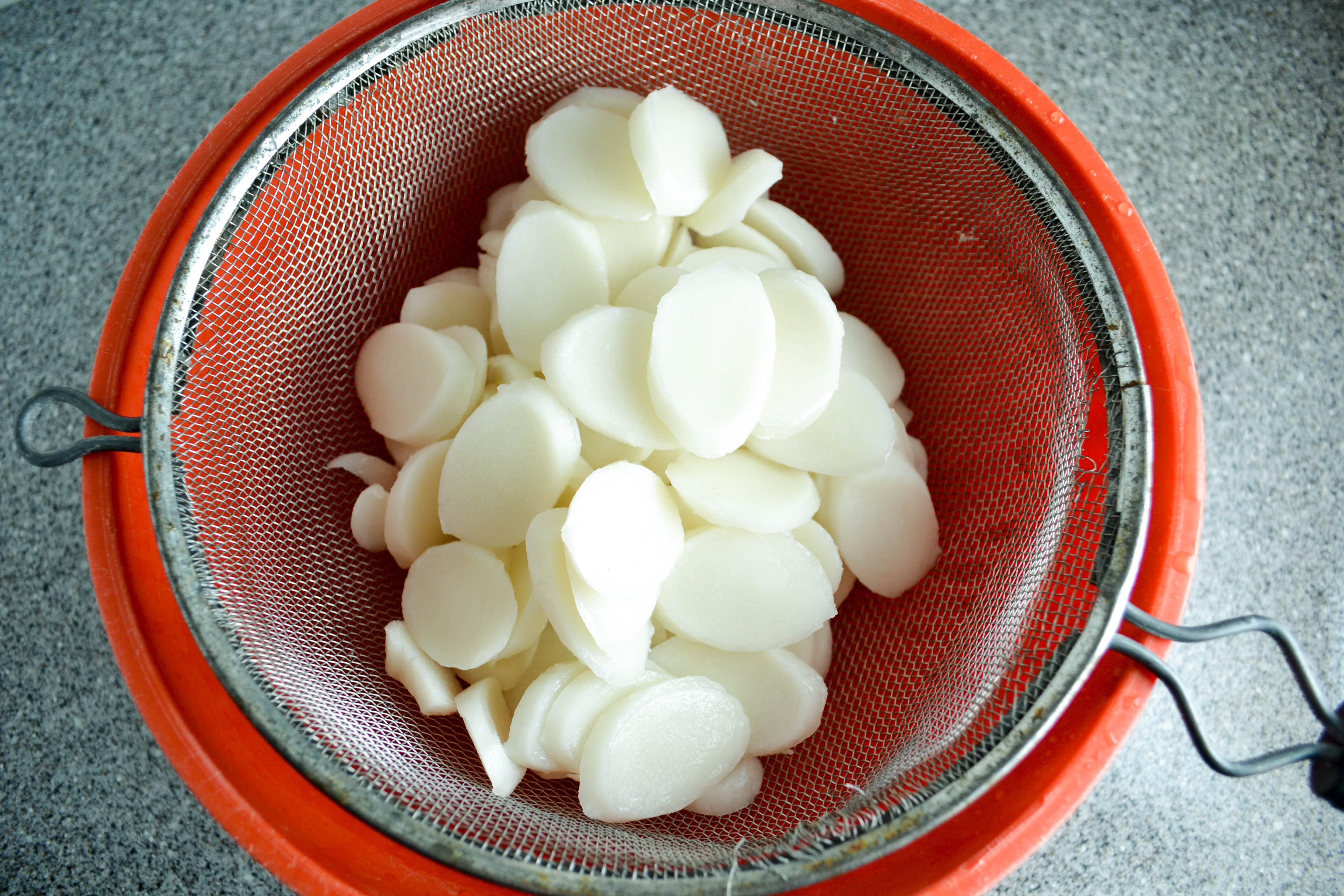 3) After 30 minutes, remove the kelp. Add soy sauce, sliced mushrooms, 1/2 the green onion and rice cakes. Simmer for about 10 minutes, or until rice cakes are soft and chewy. The soup will thicken slightly from the rice cakes.