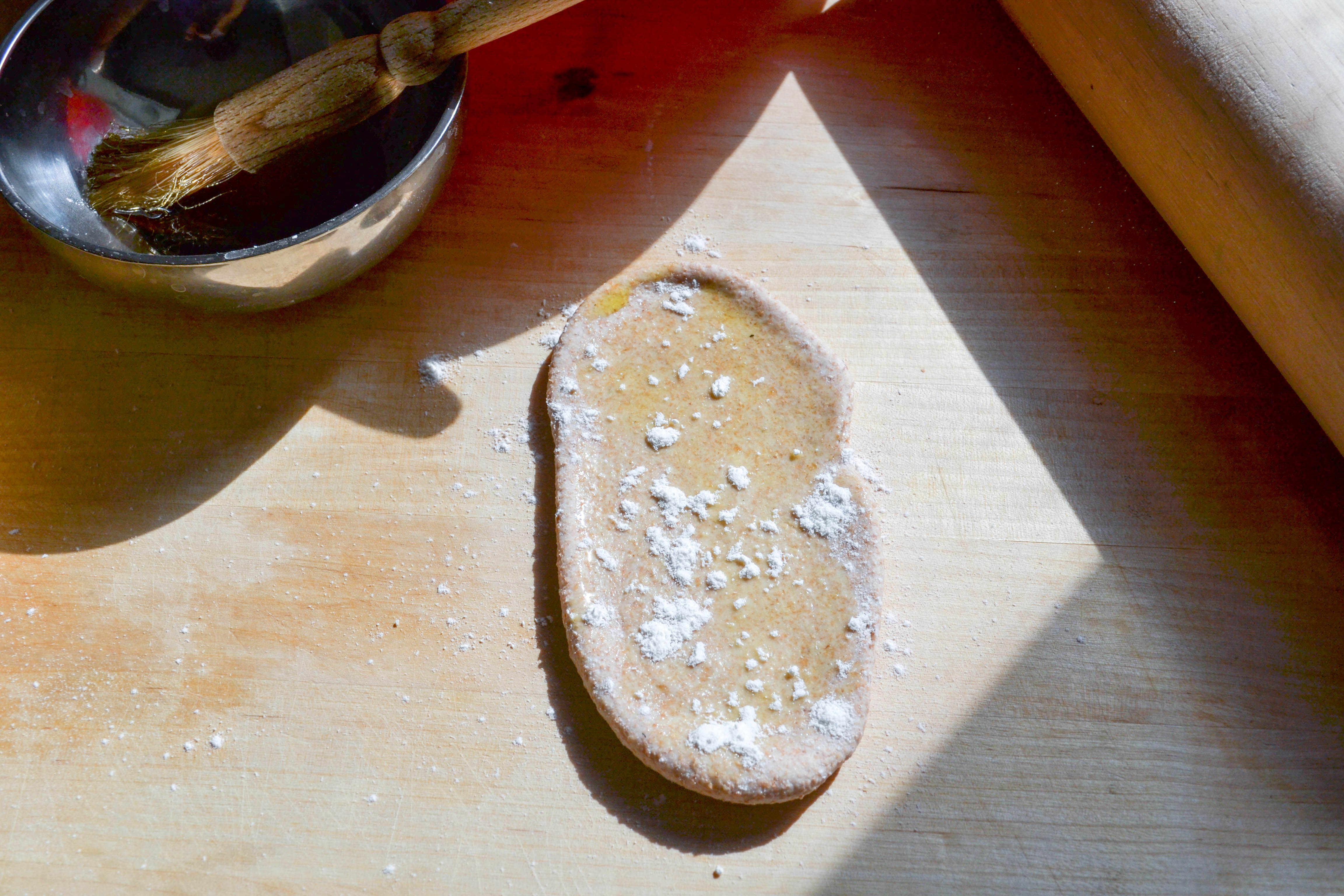 4) Take the first dough ball and roll out to a medium small oval shape.