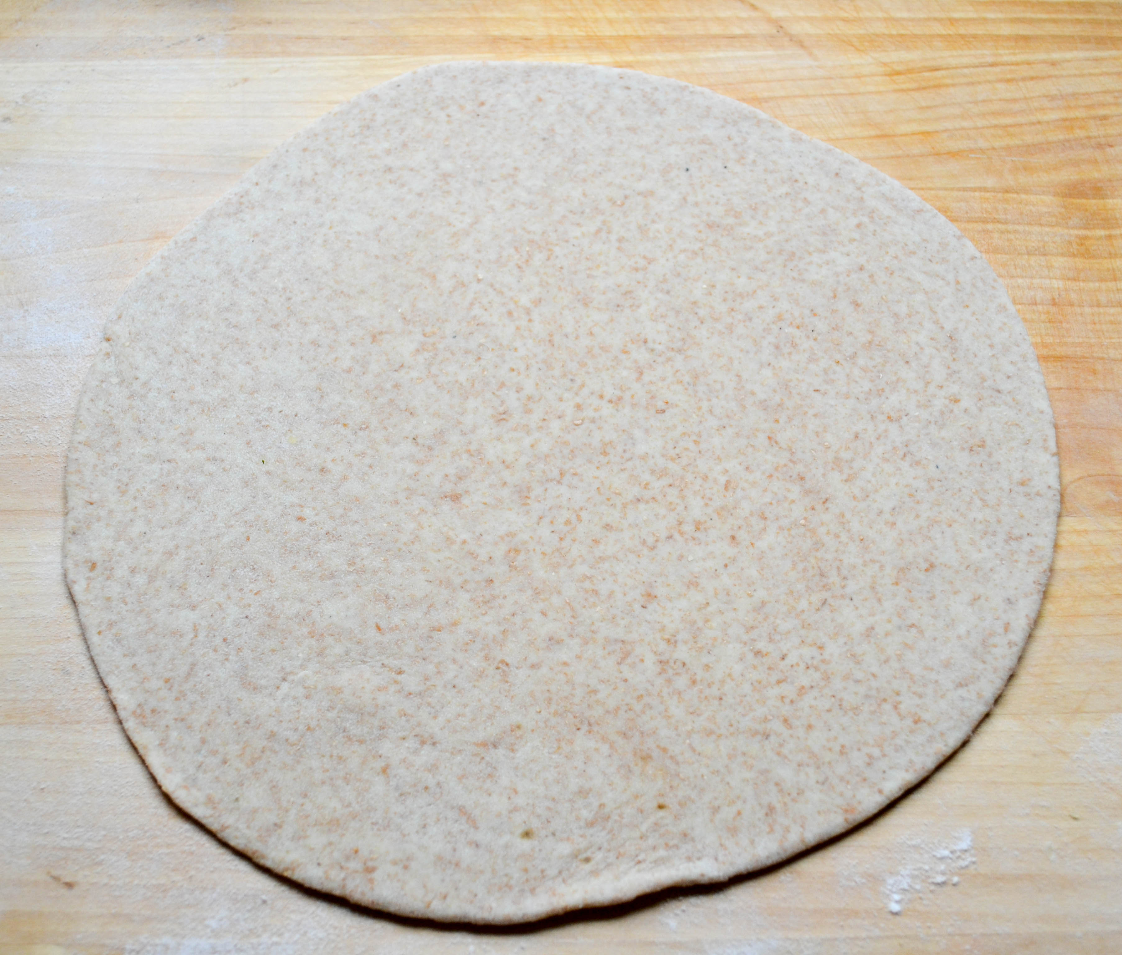 7) Gently roll out, using more flour if need be, to a large, thin circle shape.