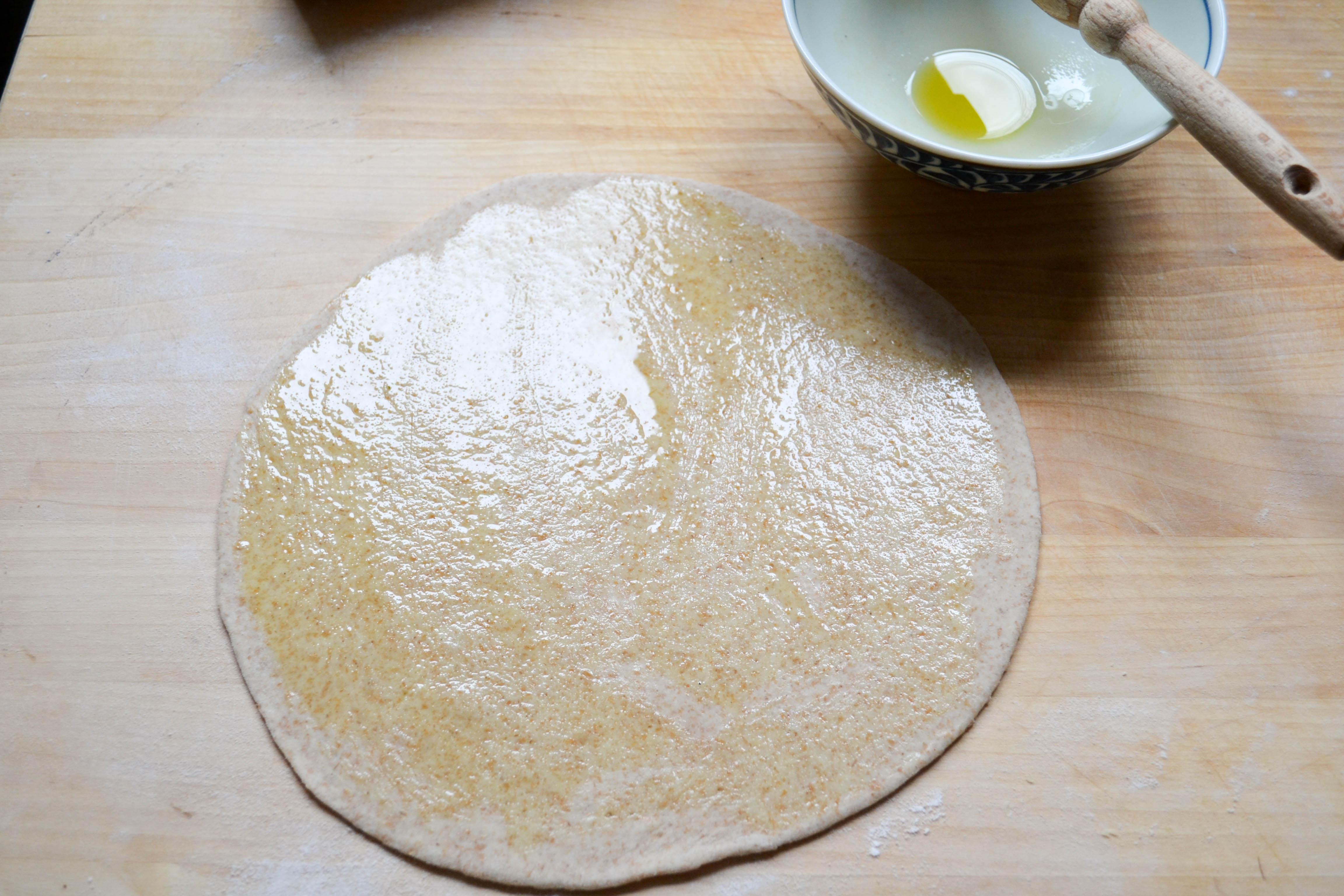 6) Brush olive oil or melted ghee, then fold in half. Brush a little more oil on the half circle shape and then fold one more time to a triangle.