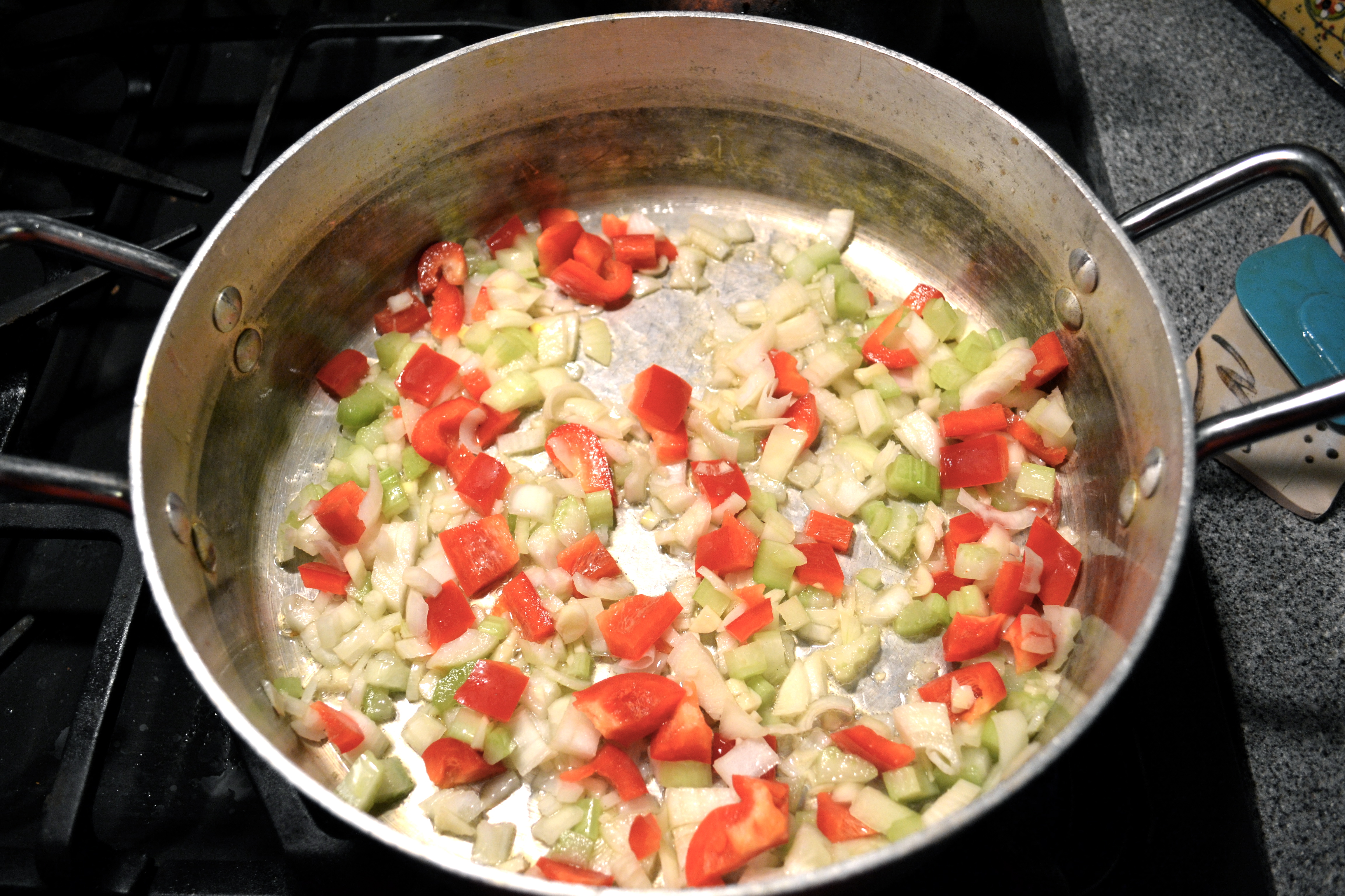 2) Use a large, wide, heavy-bottomed pan with a lid. Cover the bottom of the pan with good Spanish olive oil (about 4 glugs) and heat. Add in the chopped garlic, onion, bell peppers and celery. Sautee on med-low heat about 15 minutes.