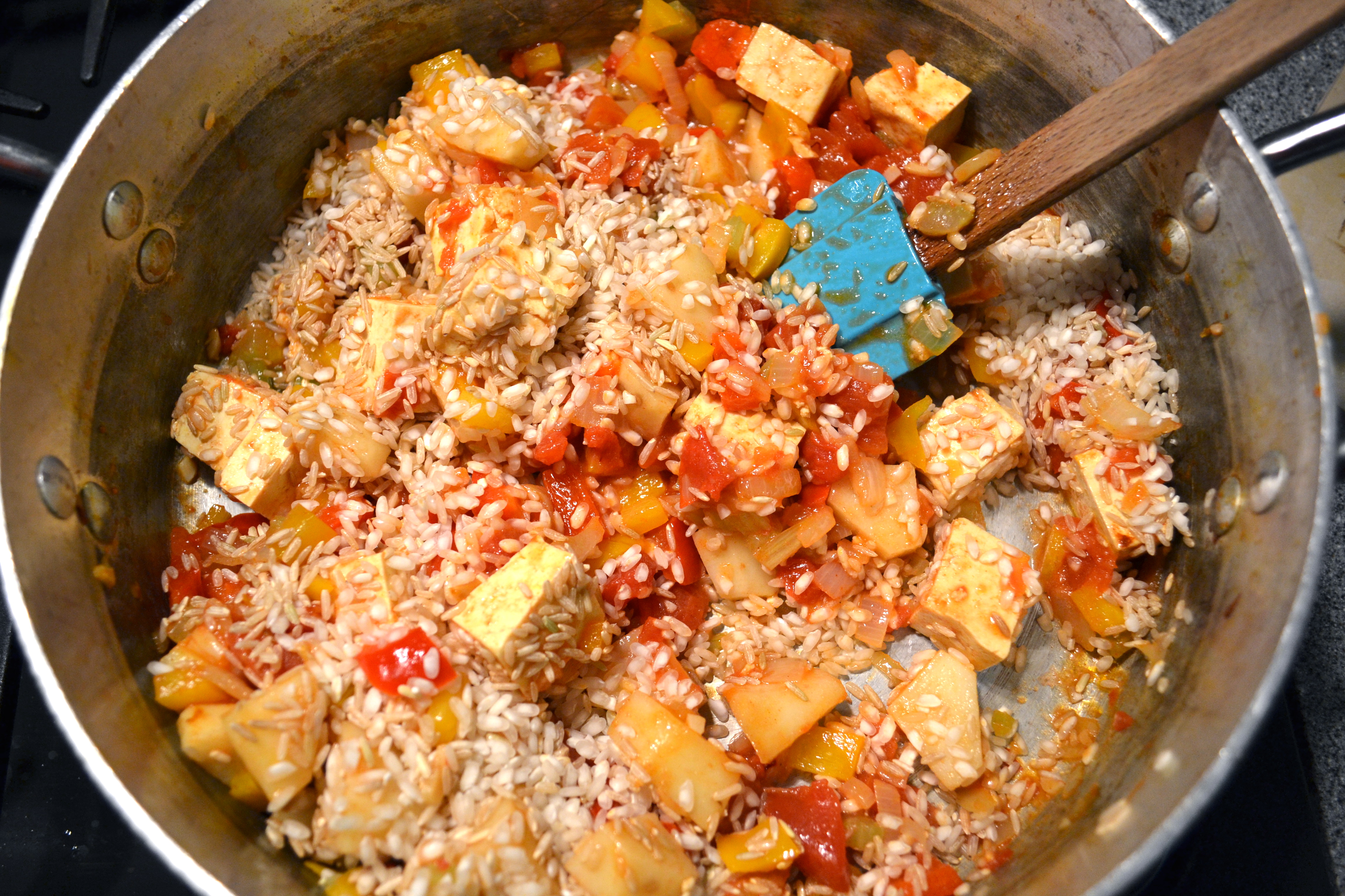 3) Add in the rest of the vegetables (except the olives), rice and spices and gently cook a couple more minutes. I like to add potato when I am eating with the kids as they are tater fans. Leave it out if you like.